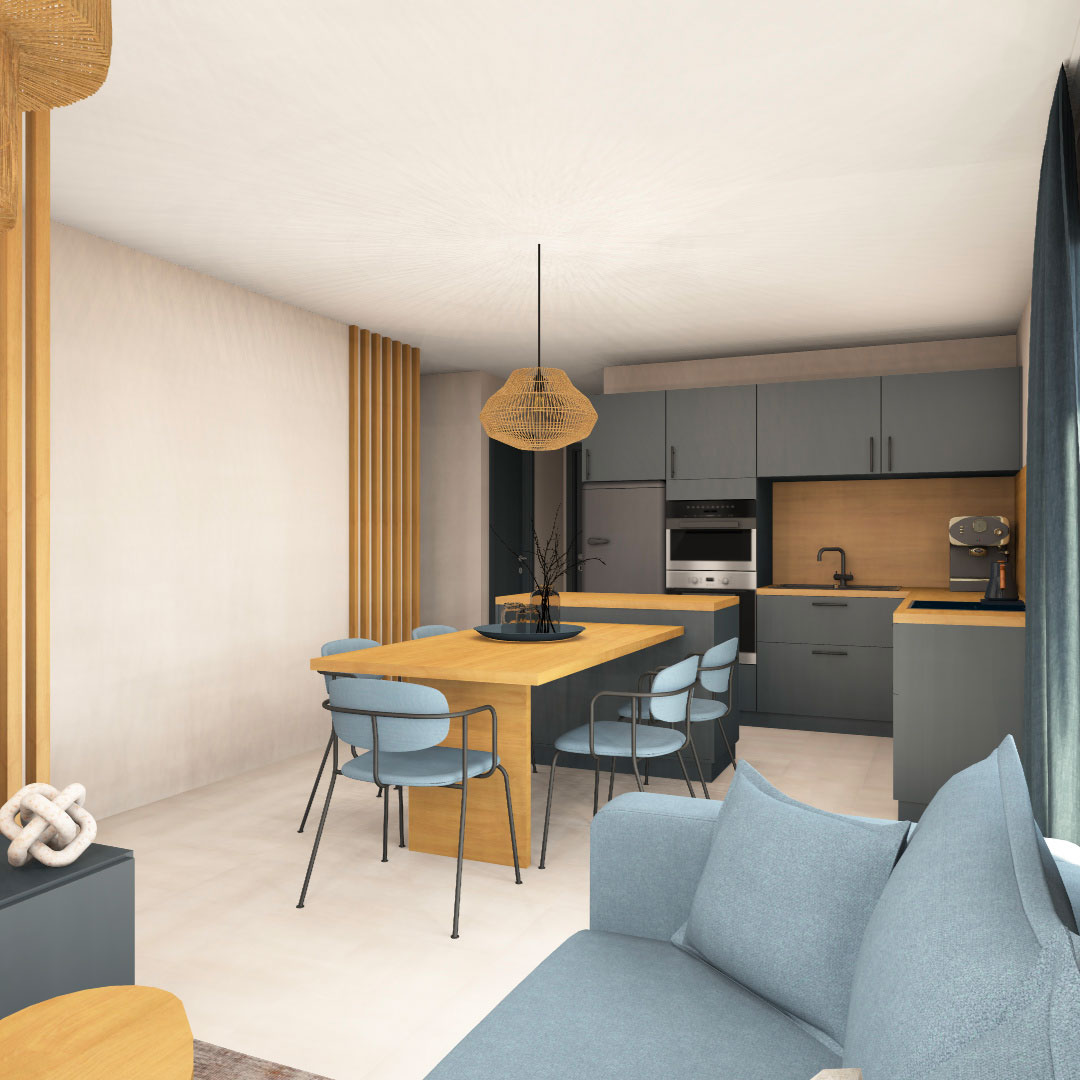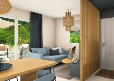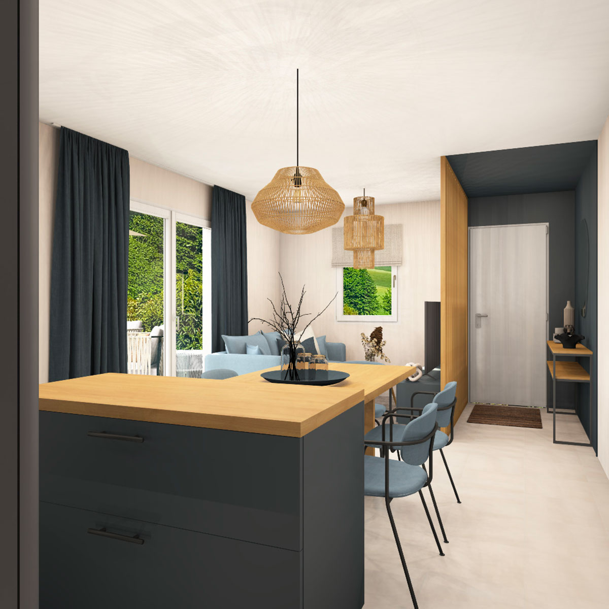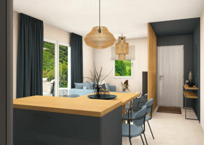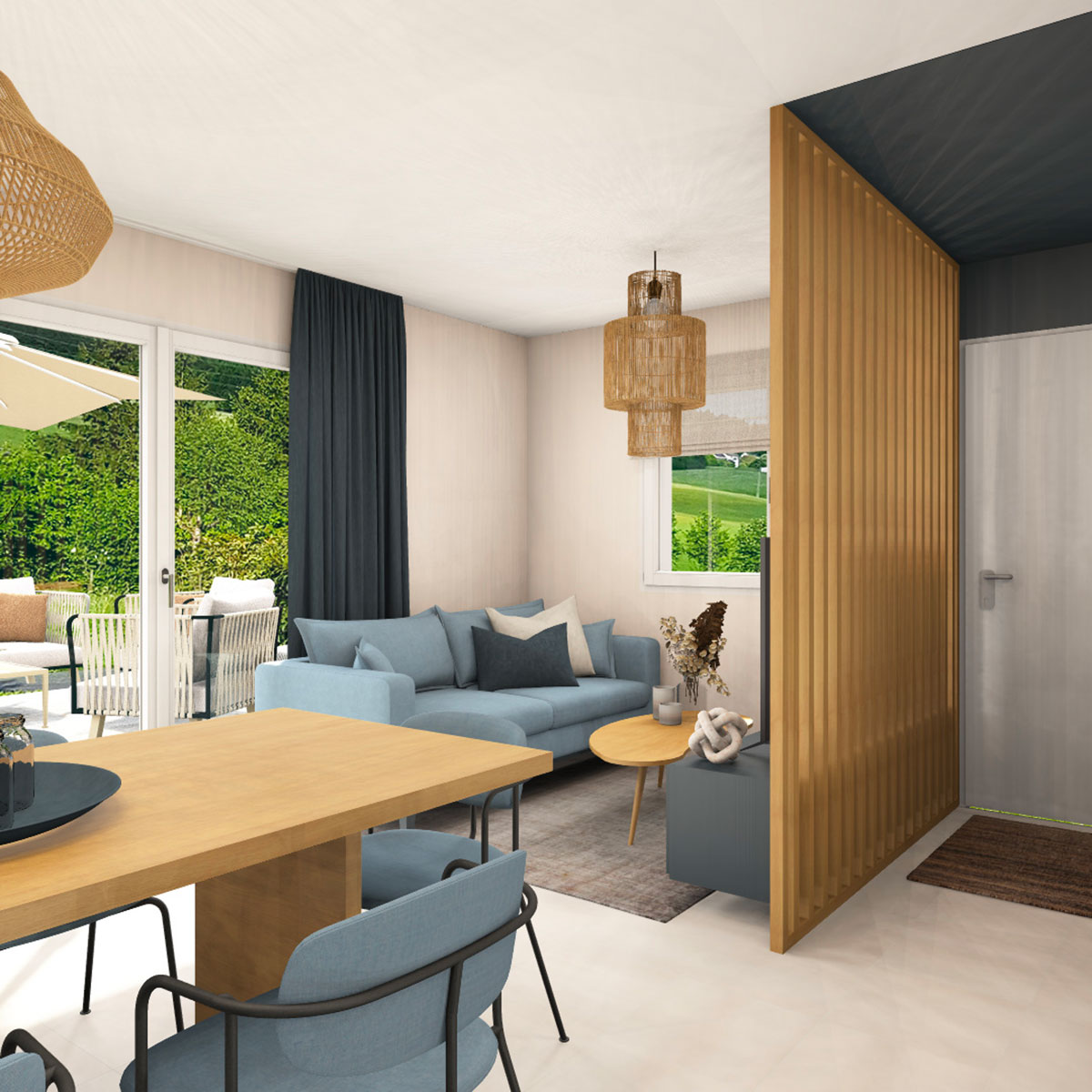 Création de visuels 3D pour l’aménagement d’un espace de vie dans une maison neuve.